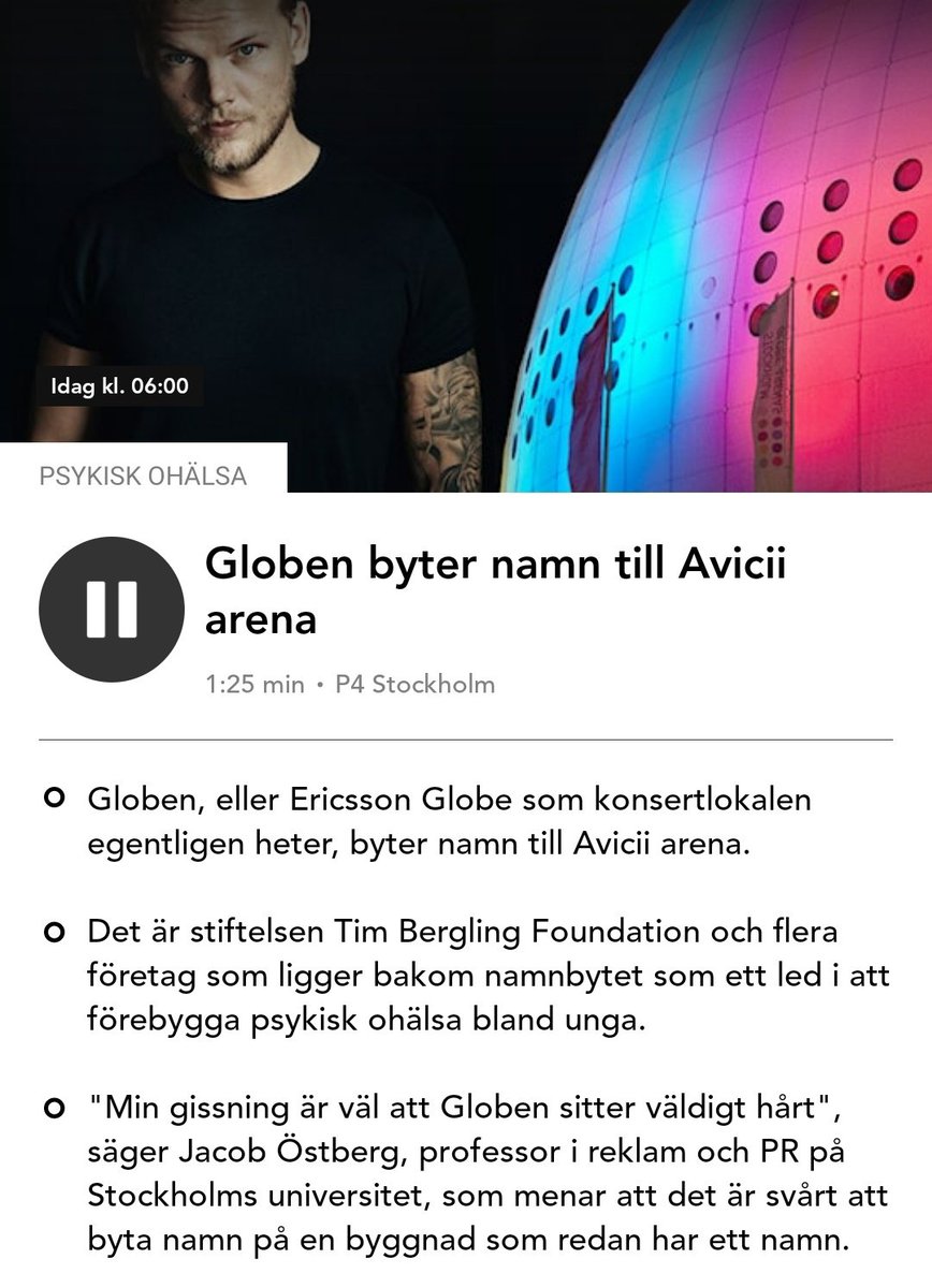 Från och med nu heter den avicii. Men tunnelbanestationen behåller sitt namn. Hade betytt mycket för tim. Hoppas att dom verkligen inte byter namn. Namnbytet är en del av ett större projekt med fler aktörer för att förebygga psykisk ohälsa bland unga. Namnet globen försvinner, men inte helt. Från och med i dag är hyllningen det nya namnet på globen, tidigare ericsson globe i stockholm. Nu byter globen i stockholm namn till avicii arena som en del i deras arbete mot psykisk ohälsa bland unga. En av sveriges mest kända och besökta evenemangsarenor, ericsson globe, byter namn till avicii arena. Stockholm live, tillsammans med tim bergling foundation, meddelade i går att en av sveriges mest kända arenabyggnader, globen, kommer byta namn från ericsson globe till avicii arena. På så vis vill man hedra världsstjärnan tim avicii berglings minne och stötta arbetet mot självmord och psykisk ohälsa. Namnbytet är en del av ett större projekt med fler aktörer för att förebygga psykisk ohälsa bland unga. Landmärket byter namn till minne av den svenske världsstjärnan.
