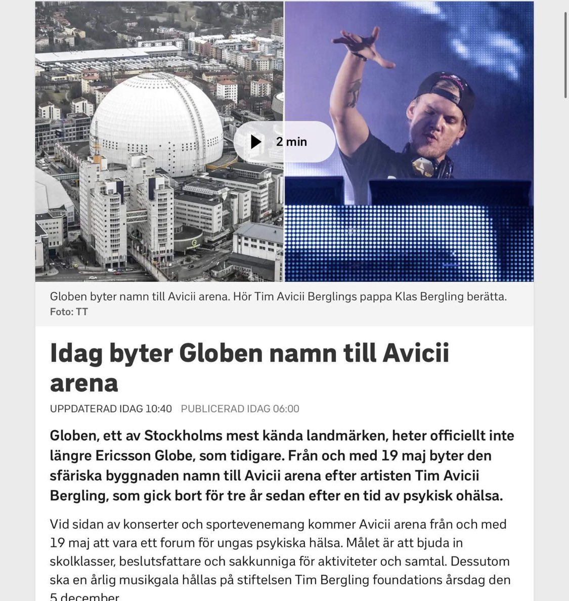 Stockholm live, tillsammans med tim bergling foundation, meddelade i går att en av sveriges mest kända arenabyggnader, globen, kommer byta namn från ericsson globe till avicii arena. Dagny carlsson, 109, inlagd på sjukhus. På så vis vill man hedra världsstjärnan tim avicii berglings minne och stötta arbetet mot självmord och psykisk ohälsa. Men avicii arena är 100ggr bättre än ericsson globe. Från och med nu heter den avicii.